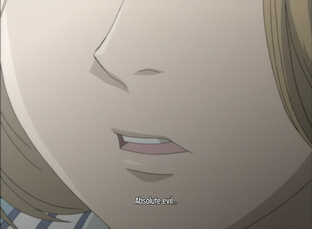 Le propos sur Perfect Blue est une interprétation, mais il nous est impossible de démêler le vrai du faux, car n’ayant que le point de vue de Mima, nous sommes coincés dans sa représentation du monde. J’utilise le terme ‘représentation’ pour faire volontairement écho à la philosophie de Schopenhauer ici. Mima refuse de voir le monde tel qu’il est, où tout n’est que Volonté pour se réfugier dans une illusion réconfortante. Il est bien connu que Nietzsche est celui qui choisit de dépasser cela. Il dépasse son maître à partir du moment où il choisit de reconnaître l’illusion du sens et d’accepter pleinement le jeu de la volonté de puissance. Pour Nietzsche, tout sens n’est qu’une stabilisation temporaire refusant d’accepter le devenir. Il n’y a pas de vérité objective. Le sens est stabilisé dans le langage, mais si toute stabilisation est illusion, alors le Verbe est mensonge qui fige le sens dans des prétendues vérités. L’erreur des humains serait d’avoir cherché des vérités universelles dans le langage, d’imaginer le bien et le mal. Dans Monster, les instigateurs du programme 511 Kinderheim partagent ce point de vue et imaginent que la solution serait alors de supprimer l’idée du mal et cela passe par la suppression du sens. À l’inverse des récits mythologiques ayant pour but pour de partager du sens aux travers d’une fiction, ils utilisent cette dernière pour détruire le sens. Si le mal naît du sens qui naît elle-même de l’individuation, alors il est nécessaire de détruire les deux. C’est pourquoi la Red Rose Mansion vise la destruction symbolique du sens par la fiction avant que le 511 Kinderheim ne s’occupe de la destruction psychologique de l’individuation par l’abstraction logique.