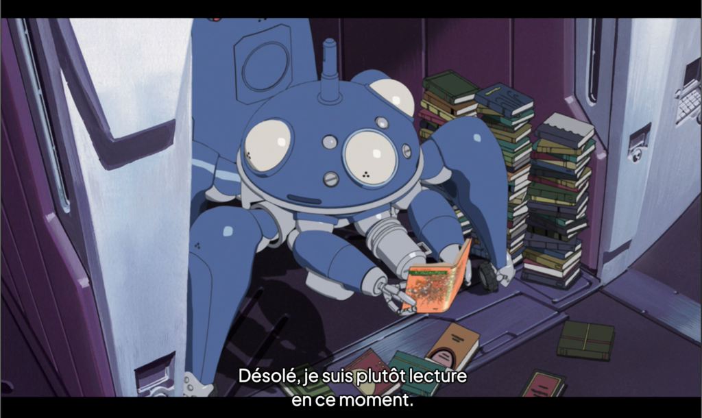 Mais est-ce que ce sens reposant sur une stabilisation temporaire ne révèle pas tout simplement une illusion ? C’est évidemment la réflexion nietzschéenne niant la possibilité de l’être en lui substituant un monde de devenir, de flux qui ne donne que l’impression de se stabiliser temporairement. Une réflexion qui sera prolongée par Deleuze et, justement, dans un épisode au titre révélateur, “Machines désirantes”, un Tachikoma est montré en train de lire Deleuze et Guattari, comme s’il pressentait lui-même que son “ghost” pourrait n’être qu’un mirage. Car selon Deleuze, la machine n’engendre pas un individu, mais un flux de désir qui traverse et connecte sans jamais se stabiliser. Là où Simondon voit une montée en cohérence, Deleuze voit une dispersion créatrice, un réseau de relations sans centre ni sujet : un rhizome. Les Tachikomas, avec leurs discussions enfantines et métaphysiques, leurs partages de mémoire et leurs divergences affectives, ne s’unifient peut-être jamais ; ils se déterritorialisent sans cesse, produisant l’illusion d’une conscience là où il n’y a que circulation d’informations et résonance du désir. Au final, le fruit de leurs expériences personnelles sont constamment synchronisées, donnant l’illusion à chacun de l’avoir vécue.