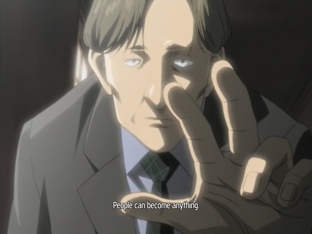 C’est ici que Monster vient offrir son contrepoint tragique. Car Johan, lui aussi, naît d’un dispositif collectif — le 511 Kinderheim —, mais un dispositif où toute tension a été supprimée. Johan et les Tachikomas partagent une autre similitude. La frontière entre leur souvenirs et celui des autres est floue. Les Tachikomas s’approprient les souvenirs de leur congénères via la synchronisation, mais Johan fait la même avec les souvenirs de sa sœur. Il choisit volontairement de prendre les souvenirs des autres afin de briser la frontière qui lui confère une identité. Il tue tous les gens qui cherchent à comprendre qui il est et souhaitent le borner. Il ne veut être rien. Au contraire, par leur curiosité, les Tachikomas révèlent une volonté de trouver leur propre personnalité. Là où les Tachikomas trouvent leur humanité dans le désaccord et la différence, Johan naît du vide absolu de sens, d’un monde où l’on a voulu effacer l’individuation. Si les Tachikomas s’interrogent sur la réalité de leur conscience, Johan, lui, ne croit plus à la réalité du sens. Il voit dans chaque tentative d’unification du monde — morale, politique ou affective — une illusion sans intérêt, un mensonge structurel comparable au “ghost” que Deleuze réduirait à un effet de flux. Mais là où le Tachikoma demeure dans la curiosité du devenir, Johan choisit d’en tirer la conséquence la plus radicale : si tout sens est illusion, alors la vie elle-même est un simulacre dont la mort seule peut délivrer. Entre les Tachikomas et Johan, c’est la même question qui se joue — celle de savoir si le sentiment d’unité qui fonde notre conscience est une véritable individuation, ou seulement l’ultime mirage du néant qui nous traverse. À cette interrogation, la réponse donnée par ces protagonistes est diamétralement opposée.